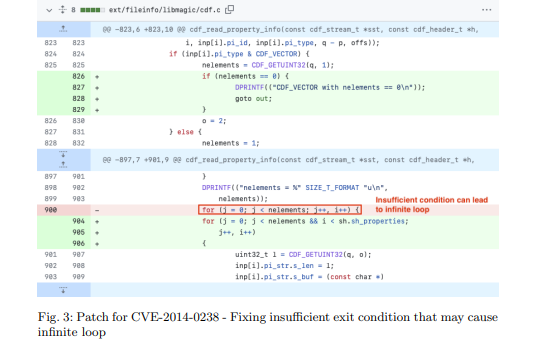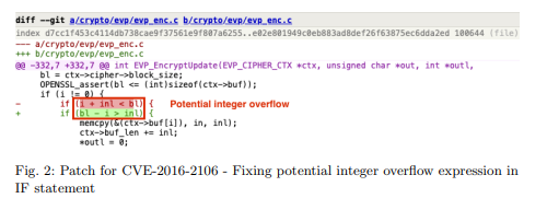 Example 2: The Integer Overflow or Wraparound weakness can trigger heap memory corruption in a vulnerable version of OpenSSL, leading to a denial of service error (CVE-2016-21065 ). The cause of this vulnerability is the integer overflow (CWE-190).6 The Integer Overflow or Wraparound weakness is a numeric error where an integer value becomes larger than the maximum size of the associated data type, forcing the system to mistakenly wrap the value around and causing the denial-of-services error. It can be seen in Figure 2 that the original condition (i + inl < b) is prone to the integer overflow because the output of the left-handside operation can exceed the range of the implicit variable type. This particular weakness was fixed by a patch that adjusted the expression by subtracting two integers, instead of adding them. Hence, in this case, the denial-of-service vulnerability from heap memory corruption was caused by the integer overflow or wraparound weakness.