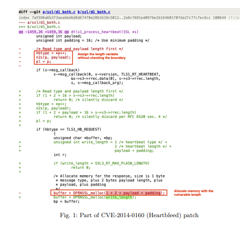 Heartbleed is one of the famous security incidents in OpenSSL that affected a large number of servers between 2012 and 2014. An OpenSSL client can send a Heartbeat message to monitor the availability of a server. The server should return the received message to the client. However, in the vulnerable version (i.e., the version with the improper input validation), OpenSSL responds with the data of any length that the client specifies. Hence, sensitive information on the server can be obtained by the client. The coding weaknesses that caused such unexpected behavior is the improper input validation of the length parameter write length. As shown in the fixing patch of the Heartbleed issue (see Figure 1), the vulnerable code was fixed by ensuring that the entered length is valid. A study by Durumeric et al. (2014) suggested that if the reviewers had identified the improper input validation in the vulnerable version of OpenSSL, this vulnerability could have been prevented early.